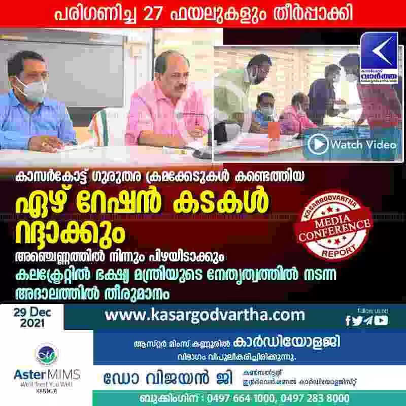കാസർകോട്ട് ഗുരുതര ക്രമക്കേടുകള്‍ കണ്ടെത്തിയ ഏഴ് റേഷൻ കടകൾ റദ്ദാക്കും; അഞ്ചെണ്ണത്തിൽ നിന്നും പിഴയീടാക്കും; കലക്ട്രേറ്റിൽ ഭക്ഷ്യ മന്ത്രിയുടെ നേതൃത്വത്തിൽ നടന്ന അദാലത്തിൽ തീരുമാനം