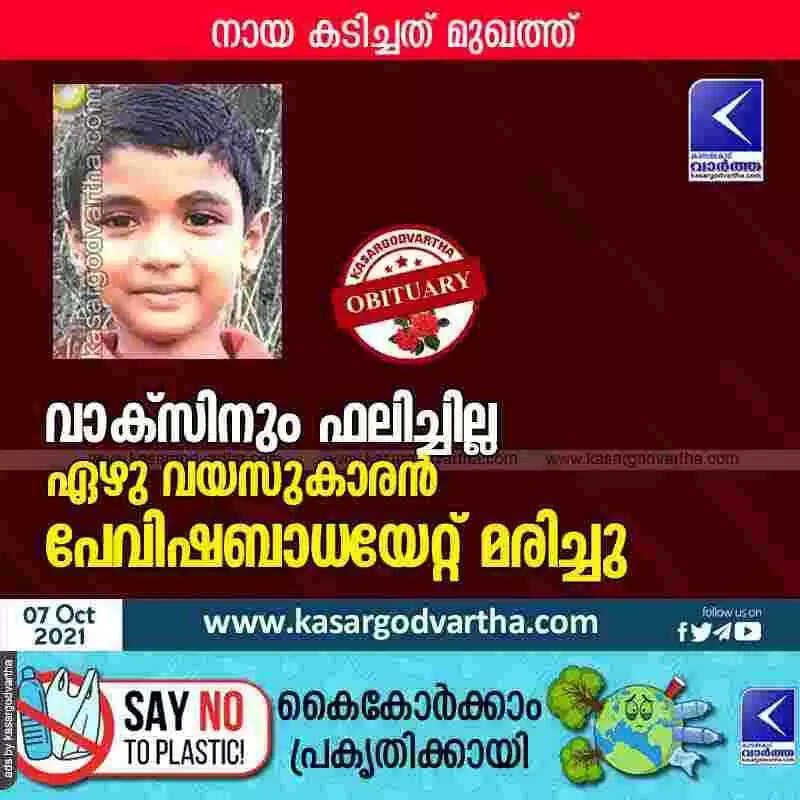 Keywords:  Kerala, Kasaragod, News, Dog bite, Child, Top-Headlines, Died, Medical College, Seven-year-old boy died