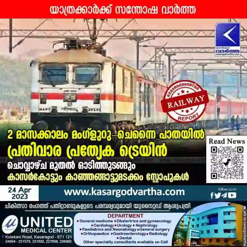Railway | യാത്രക്കാർക്ക് സന്തോഷ വാർത്ത: 2 മാസക്കാലം മംഗ്ളുറു - ചെന്നൈ പാതയിൽ പ്രതിവാര പ്രത്യേക ട്രെയിൻ; ചൊവ്വാഴ്ച മുതൽ ഓടിത്തുടങ്ങും; കാസർകോട്ടും കാഞ്ഞങ്ങാട്ടുമടക്കം സ്റ്റോപുകൾ