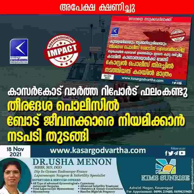കാസർകോട് വാർത്ത റിപോർട് ഫലംകണ്ടു; തീരദേശ പൊലീസില് ബോട് ജീവനക്കാരെ നിയമിക്കാൻ നടപടി തുടങ്ങി