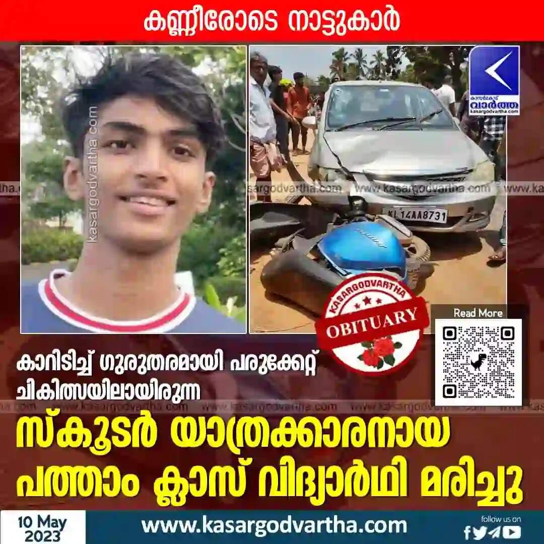 Accidental Death | സ്കൂടറില് യാത്ര ചെയ്യുന്നതിനിടെ കാറിടിച്ച് ഗുരുതരമായി പരുക്കേറ്റ് ചികിത്സയിലായിരുന്ന പത്താം ക്ലാസ് വിദ്യാര്ഥി മരിച്ചു