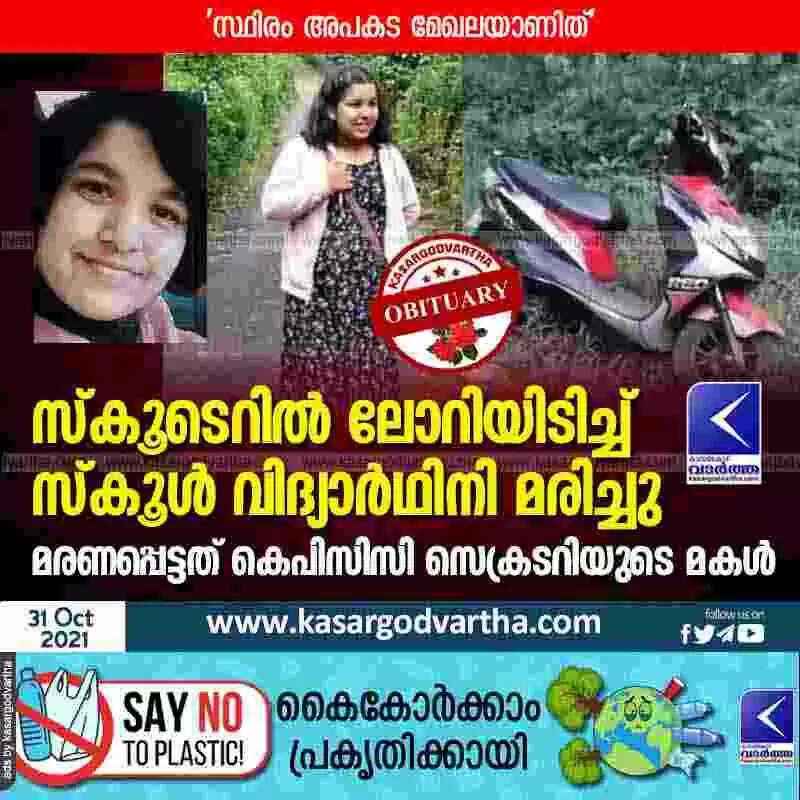 സ്കൂടെറിൽ ലോറിയിടിച്ച് സ്കൂൾ വിദ്യാർഥിനി മരിച്ചു; മരണപ്പെട്ടത് കെപിസിസി സെക്രടറിയുടെ മകൾ