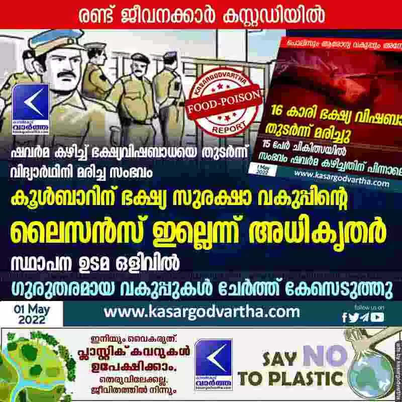 Keywords: Cheruvathur, Kasaragod, Kerala, News, Food, Top-Headlines, Case, Arrest, Police, Complaint, Health, Death, Student dies of food poisoning after eating shawarma; Coolbar not licensed by Department of Food Safety.