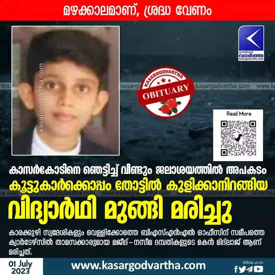 കാഞ്ഞങ്ങാട്: (www.kasargodvartha.com) കാസര്‍കോടിനെ ഞെട്ടിച്ച് വീണ്ടും ജല ദുരന്തം. കൂട്ടുകാര്‍ക്കൊപ്പം തോട്ടില്‍ കുളിക്കാനിറങ്ങിയ വിദ്യാര്‍ഥി മുങ്ങി മരിച്ചു. കാരക്കുഴി സ്വദേശികളും വെള്ളിക്കോത്തെ ബിഎസ്എന്‍എല്‍ ഓഫീസിന് സമീപത്തെ ക്വാര്‍ടേഴ്‌സില്‍ താമസക്കാരുമായ മജീദ് - നസീമ ദമ്പതികളുടെ മകന്‍ മിദ്ലാജ് (13) ആണ് മരിച്ചത്.