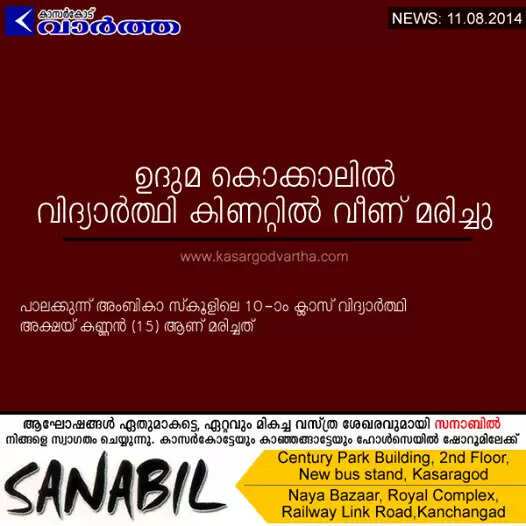 ഉദുമ: (www.kasargodvartha.com 11.08.2014) ഉദുമ കൊക്കാലില് 15 വയസുകാരന് കിണറ്റില് വീണ് മരിച്ചു. കൊക്കാല് ഷണ്മുഖ മഠത്തിന് സമീപത്തെ കൈലാസ് വീട്ടിലെ കണ്ണന് - രോഹിണി ദമ്പതികളുടെ മകനും പാലക്കുന്ന് അംബിക ഇംഗ്ലീഷ് മീഡിയം സ്കൂളിലെ 10-ാം ക്ലാസ് വിദ്യാര്ത്ഥിയുമായ അക്ഷയ് കണ്ണന് (15) ആണ് മരിച്ചത്.