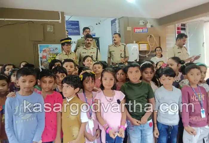 നീലേശ്വരം: (www.kasargodvartha.com) പാട്ടും കാര്യവുമായി വിദ്യാര്‍ഥികള്‍ പൊലീസ് സ്റ്റേഷനില്‍ ഇത്തിരി നേരം ചിലവഴിച്ചത് കൗതുകകരമായി. നീലേശ്വരം ജിഎല്‍പി സ്‌കൂളിലെ രണ്ടാം ക്ലാസിലെ കുട്ടികളാണ് പഠന പ്രവര്‍ത്തനത്തിന്റെ ഭാഗമായി നീലേശ്വരം സൗഹ്യദ പൊലീസ് സ്റ്റേഷനില്‍ എത്തിയത്. വിദ്യാര്‍ഥികളെ കാക്കിയിട്ട മാമന്‍മാര്‍ മധുരം നല്‍കി സ്വീകരിച്ചു. ഇന്‍സ്‌പെക്ടര്‍ കെ പ്രേംസദന്‍ കുട്ടികളുമായി സംവദിച്ച് സമൂഹത്തില്‍ പൊലീസിന്റെ ആവശ്യകതയെയും അവര്‍ ചെയ്യുന്ന സേവനങ്ങളും കടമകളെയും സംബന്ധിച്ചും കുട്ടികള്‍ക്ക് പറഞ്ഞു കൊടുത്തു.