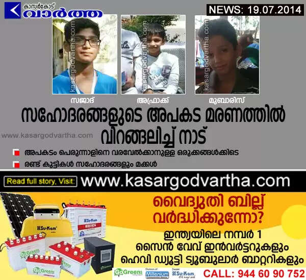 കാസര്കോട്: (www.kasargodvartha.com 19.07.2014) പെരുന്നാളിനെ വരവേല്ക്കാനുള്ള ഒരുക്കങ്ങളില് മുഴുകിയിരിക്കെയാണ് നെല്ലിക്കുന്നിലേക്ക് മൂന്ന് കുട്ടികളുടെ അപകട മരണ വാര്ത്ത എത്തിയത്. ആദ്യം ഇത് വിശ്വസിക്കാന് വീട്ടുകാര്ക്കോ, ബന്ധുക്കള്ക്കോ സാധിച്ചില്ല. കേട്ടവാര്ത്ത സത്യമാവല്ലേയെന്ന് നെല്ലിക്കുന്ന് ഗ്രാമം ഒന്നടങ്കം പ്രാര്ത്ഥിച്ചു. ശനിയാഴ്ച വൈകുന്നേരം നോമ്പ് തുറക്കാന് മണിക്കൂറുകള് മാത്രം ബാക്കി നില്ക്കെയാണ് നാടിനെ കണ്ണീരിലാഴ്ത്തി നെല്ലിക്കുന്നിലെ എ.എം.സി സാബിറിന്റെ മകന് സജാദ് (15), നെല്ലിക്കുന്നിലെ മുഹമ്മദിന്റെ മകന് മുബാരിസ് (10), നെല്ലിക്കുന്നിലെ അഫ്രാസിന്റെ മകന് അഫ്രാക്ക് (ഏഴ്) എന്നിവരുടെ മരണ വാര്ത്ത എത്തിയത്.