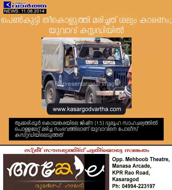 തൃക്കരിപ്പൂര്‍: (www.kasargodvartha.com 11.08.2014) തൃക്കരിപ്പൂരില്‍ 10-ാം ക്ലാസ് വിദ്യാര്‍ത്ഥിനി ദുരൂഹ സാഹചര്യത്തില്‍ പൊള്ളലേറ്റ് മരിച്ച സംഭവത്തില്‍ യുവാവിനെ ചന്തേര പോലീസ് കസ്റ്റഡിയിലെടുത്തു. തൃക്കരിപ്പൂര്‍ കൊയങ്കരയിലെ ജിഷ്‌ന ( 15 ) മരിച്ച സംഭവത്തില്‍ തടിയന്‍കൊവ്വല്‍ ബസ് സ്റ്റാന്‍ഡിന് കിഴക്കുവശത്ത് താമസിക്കുന്ന യുവാവിനെയാണ് കസ്റ്റഡിയിലെടുത്തത്.
