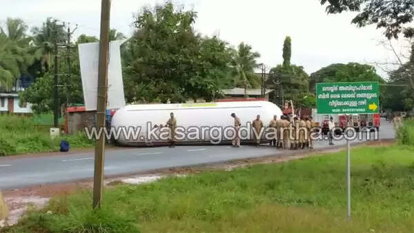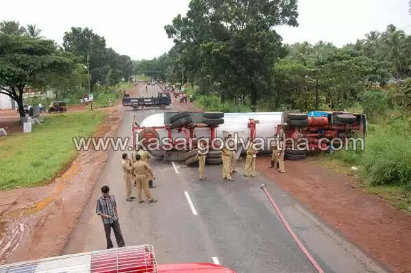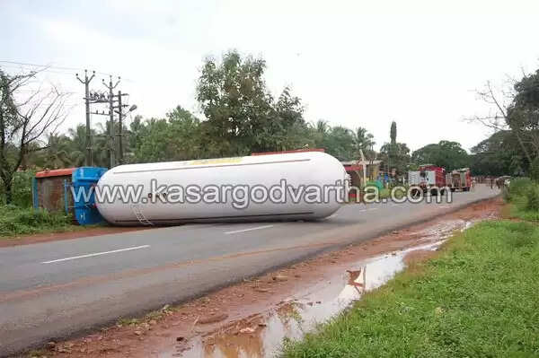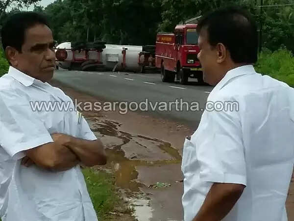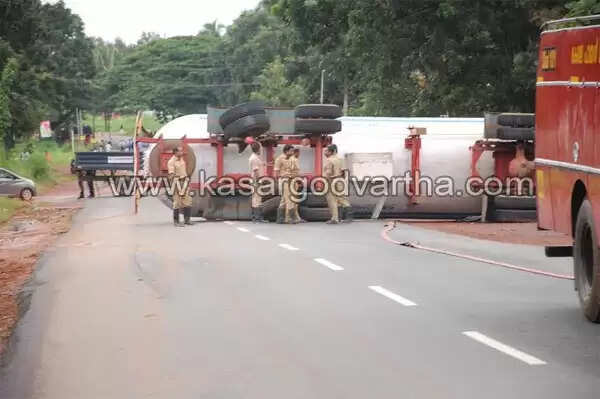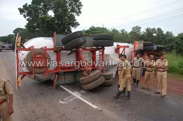 മംഗളൂരുവില്നിന്ന് കണ്ണൂരിലേക്ക് ഗ്യാസുമായി പോവുകയായിരുന്ന ടാങ്കര് ലോറിയാണ് റോഡിന് കുറുകെയായി മറിഞ്ഞത്. ലോറി ഡ്രൈവറും സഹായിയും പരിക്കുകളോടെ അത്ഭുതകരമായി രക്ഷപ്പെട്ടു. വിവരമറിഞ്ഞ് കാസര്കോട് നിന്നും എത്തിയ ഫയര്ഫോഴ്സും വിദ്യാനഗര് പോലീസും നാട്ടുകാരും ചേര്ന്നാണ് രക്ഷാപ്രവര്ത്തനം നടത്തിയത്.