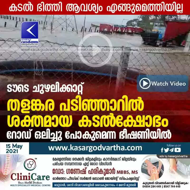 ടൗടെ ചുഴലിക്കാറ്റ്; തളങ്കര പടിഞ്ഞാറിൽ ശക്തമായ കടൽക്ഷോഭം; റോഡ് ഒലിച്ചു പോകുമെന്ന ഭീഷണിയിൽ