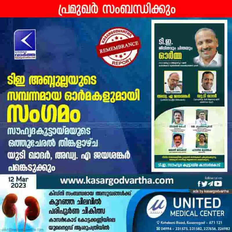 Keywords: Kasaragod, Kerala, News, Latest-News, T E Abdulla, Municipal Conference Hall, Remembrance, Remembering, MLA, President, TE Abdulla Memorial Meeting on March 13. < !- START disable copy paste -->