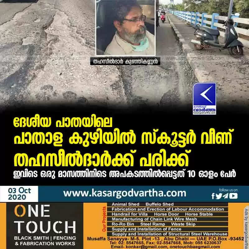 ദേശീയ പാതയിലെ പാതാള കുഴിയിൽ സ്കൂട്ടർ വീണ് തഹസീൽദാർക്ക് പരിക്ക്; ഇവിടെ ഒരു മാസത്തിനിടെ അപകടത്തിൽപ്പെട്ടത് 10 ഓളം പേർ