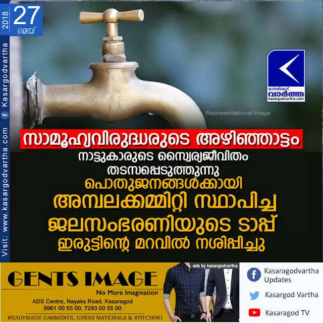 സാമൂഹ്യവിരുദ്ധരുടെ അഴിഞ്ഞാട്ടം നാട്ടുകാരുടെ സൈ്വര്യജീവിതം തടസപ്പെടുത്തുന്നു; പൊതുജനങ്ങള്ക്കായി അമ്പലക്കമ്മിറ്റി സ്ഥാപിച്ച ജലസംഭരണിയുടെ ടാപ്പ് ഇരുട്ടിന്റെ മറവില് നശിപ്പിച്ചു
