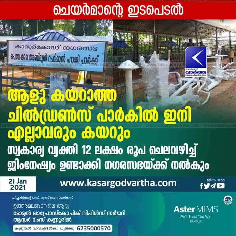 കാസർകോട്: (www.kasargodvartha.com 21.01.2021) ആളു കയറാത്ത ചിൽഡ്രൺസ് പാർകിൽ ഇനി എല്ലാവരും കയറും. സ്വകാര്യ വ്യക്തി 12 ലക്ഷം രൂപ ചെലവഴിച്ച് ജിംനേഷ്യം ഉണ്ടാക്കി നഗരസഭയ്ക്ക് നൽകും.