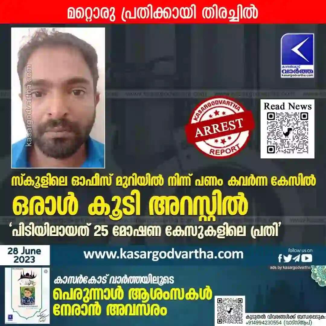 Arrested | സ്കൂളിലെ ഓഫീസ് മുറിയിൽ നിന്ന് പണം കവർന്ന കേസിൽ ഒരാൾ കൂടി അറസ്റ്റിൽ; 'പിടിയിലായത് 25 മോഷണ കേസുകളിലെ പ്രതി'