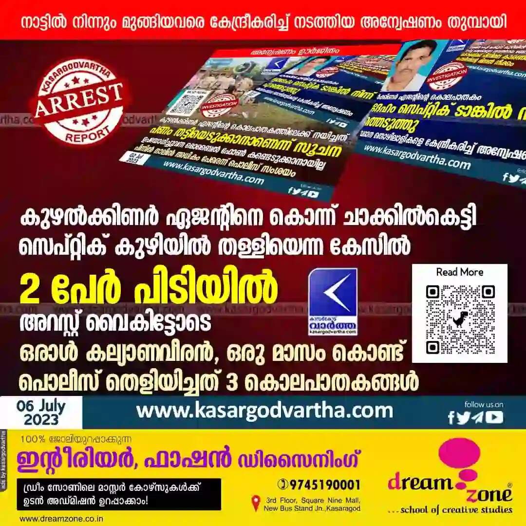 Arrested | കുഴല്‍ക്കിണര്‍ ഏജന്റിനെ കൊന്ന് ചാക്കില്‍കെട്ടി സെപ്റ്റിക് കുഴിയില്‍ തള്ളിയെന്ന കേസില്‍ 2 പേര്‍ പിടിയില്‍; അറസ്റ്റ് വൈകിട്ടോടെ; ഒരാള്‍ കല്യാണവീരന്‍, ഒരു മാസം കൊണ്ട് പൊലീസ് തെളിയിച്ചത് 3 കൊലപാതകങ്ങള്‍