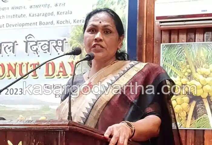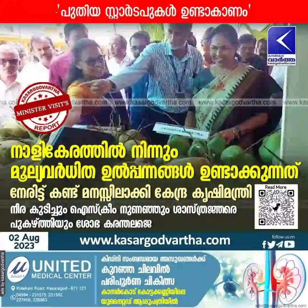 Keywords: Kerala News, Malayalam News, Shobha Karantalaje, Kasaragod News, Coconut Products, World Coconut Day, Union Agriculture Minister Shobha Karantalaje visits Coconut Products stalls.