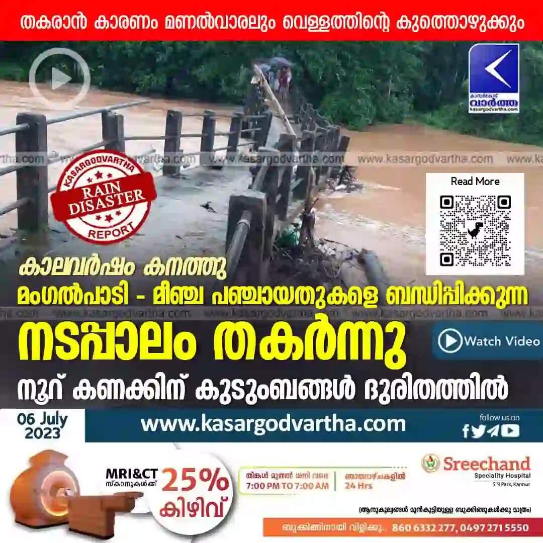 Bridge Collapsed | കാലവര്ഷം കനത്തു: മംഗല്പാടി - മീഞ്ച പഞ്ചായതുകളെ ബന്ധിപ്പിക്കുന്ന നടപ്പാലം തകര്ന്നു; നൂറ് കണക്കിന് കുടുംബങ്ങള് ദുരിതത്തില്