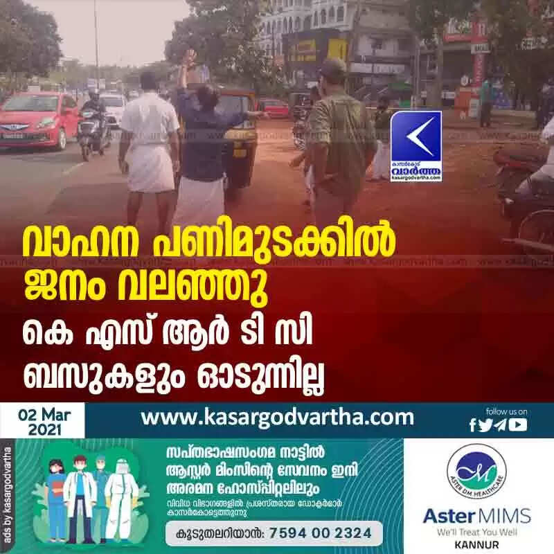 കാസർകോട്: (www.kasargodvartha.com 02.03.2021) പെട്രോൾ, ഡീസൽ വില വർദ്ധനവിൽ പ്രതിഷേധിച്ച് സംയുക്ത സമരസമിതി ആഹ്വാനം ചെയ്ത വാഹന പണിമുടക്കിൽ ജനം വലഞ്ഞു. രാവിലെ ആറ് മണിക്കാണ് പണിമുടക്ക് ആരംഭിച്ചത്. കെഎസ്ആർടിസി, സ്വകാര്യ ബസുകളൊന്നും ഓടുന്നില്ല. ഓടോറിക്ഷ, ടാക്സി, ചെറുകിട വാഹനങ്ങൾ, ചരക്ക് കടത്തു വാഹനങ്ങൾ തുടങ്ങിയവയും നിരത്തിലിറങ്ങുന്നില്ല. സെർവീസ് നടത്തിയ ഓടോറിക്ഷ അടക്കമുള്ള വാഹനങ്ങളെ സമരക്കാർ വിവിധയിടങ്ങളിൽ തടയുന്നുണ്ട്. ബിഎംഎസ് ഒഴികെയുള്ള എല്ലാ ട്രേഡ് യൂണിയനുകളും പണിമുടക്കില്‍ പങ്കെടുക്കുന്നുണ്ട്.