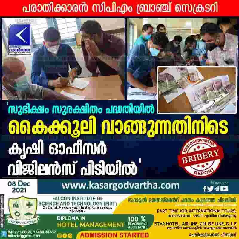 'സുഭിക്ഷം സുരക്ഷിതം പദ്ധതിയിൽ കൈക്കൂലി വാങ്ങുന്നതിനിടെ കൃഷി ഓഫീസർ വിജിലൻസ് പിടിയിൽ'; പരാതിക്കാരൻ സിപിഎം ബ്രാഞ്ച് സെക്രടറി