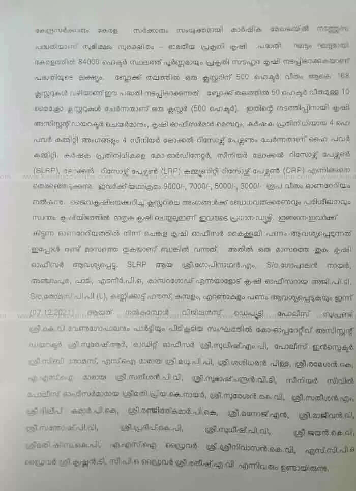 ബാക്കി 2000 രൂപ ഉടനെ എത്തിക്കണമെന്ന് നിർദേശിക്കുകയും ചെയ്തിരുന്നതായും ആരോപിക്കുന്നു. പണം നൽകുന്നതിനെ പാടശേഖര സെക്രടറി എതിർത്തിരുന്നുവെന്നാണ് വിവരം.