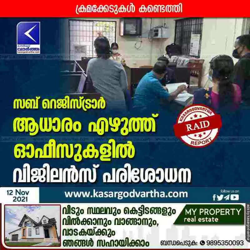 സബ് റെജിസ്ട്രാർ, ആധാരം എഴുത്ത് ഓഫീസുകളിൽ വിജിലൻസ് പരിശോധന; ക്രമക്കേടുകൾ കണ്ടെത്തി