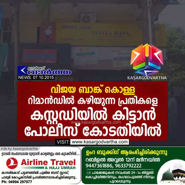 Keywords : Kasaragod, Kerala, Bank, Robbery, Accuse, Police, Investigation, Kanhangad, Vijaya Bank Robbery, Vijaya bank robbery: Police approaches court for accused