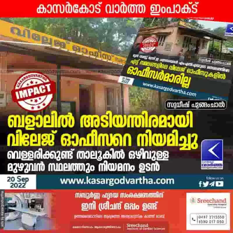 Village officer appointed | കാസര്കോട് വാര്ത്ത ഇംപാക്ട്: ബളാലില് അടിയന്തിരമായി വിലേജ് ഓഫീസറെ നിയമിച്ചു; വെള്ളരിക്കുണ്ട് താലൂകില് ഒഴിവുള്ള മുഴുവന് സ്ഥലത്തും നിയമനം ഉടന്