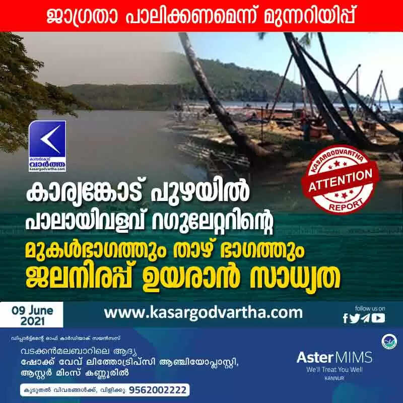 കാര്യങ്കോട് പുഴയിൽ പാലായിവളവ് റഗുലേറ്ററിന്റെ മുകൾഭാഗത്തും താഴ് ഭാഗത്തും ജലനിരപ്പ് ഉയരാൻ സാധ്യത: ജാഗ്രതാ പാലിക്കണമെന്ന് മുന്നറിയിപ്പ്