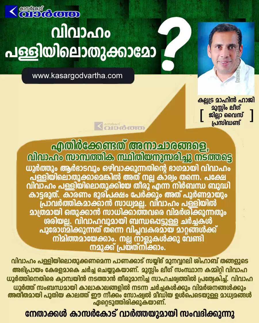 ധൂര്‍ത്തും ആര്‍ഭാടവും ഒഴിവാക്കുന്നതിന്റെ ഭാഗമായി വിവാഹം പള്ളിയിലൊതുക്കാമെങ്കില്‍ അത് നല്ല കാര്യം തന്നെ. പക്ഷേ വിവാഹം പള്ളിയിലൊതുക്കിയേ തീരൂ എന്ന നിര്‍ബന്ധ ബുദ്ധി കാട്ടരുത്. കാരണം ഭൂരിപക്ഷം പേര്‍ക്കും അത് പൂര്‍ണമായും പ്രാവര്‍ത്തികമാക്കാന്‍ സാധ്യമല്ല. വിവാഹം പള്ളിയില്‍ മാത്രമായി ഒതുക്കാന്‍ സാധിക്കാത്തവരെ വിമര്‍ശിക്കുന്നതും ശരിയല്ല. സമൂഹ്യപ്രശ്‌നങ്ങളില്‍ ഇടപെടുകയും രാഷ്ട്രീയ സാമൂഹ്യ സാംസ്‌കാരിക രംഗങ്ങളില്‍ നിറഞ്ഞ് നില്‍ക്കുകയും ചെയ്യുന്ന സാമ്പത്തിക ശേഷിയുള്ളവരോട് വരനും, വധുവിന്റെ പിതാവും, ഖത്തീബും മാത്രം ചേര്‍ന്ന് നിക്കാഹ് കര്‍മം നടത്തിയാല്‍ മതിയെന്നു പറയുന്നത് അമിതാവേശത്തിന്റെ ഭാഗമായി മാത്രമേ പൊതുസമൂഹം വിലയിരുത്തുകയുള്ളൂ.