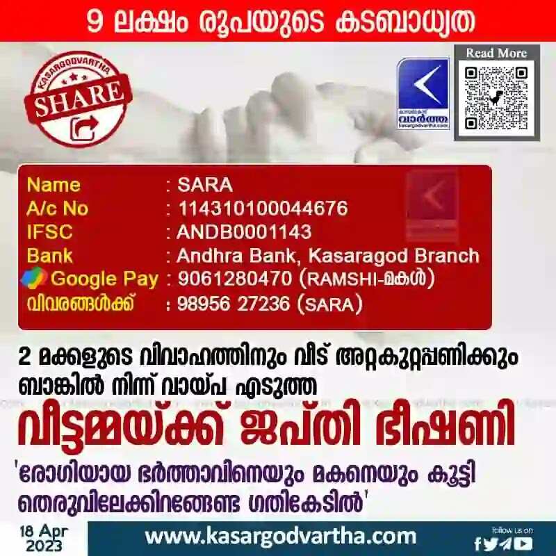 Keywords: Charity-News, Financial-Aid, Bank-Loan-News, Kerala News, Kasaragod News, Malayalam News, Woman seeks financial aid.