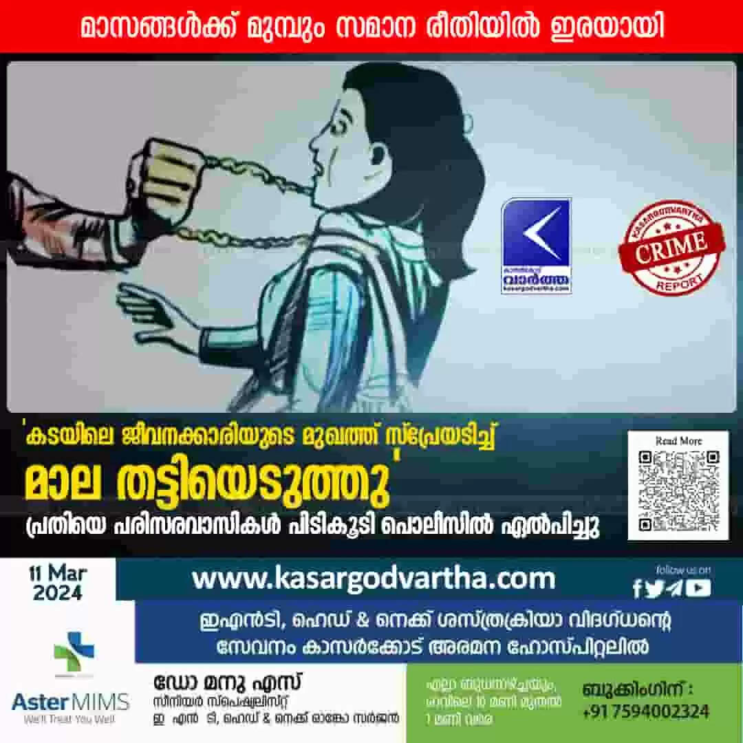 Robbery | 'കടയിലെ ജീവനക്കാരിയുടെ മുഖത്ത് സ്പ്രേയടിച്ച് മാല തട്ടിയെടുത്തു'; പ്രതിയെ പരിസരവാസികൾ പിടികൂടി പൊലീസിൽ ഏൽപിച്ചു