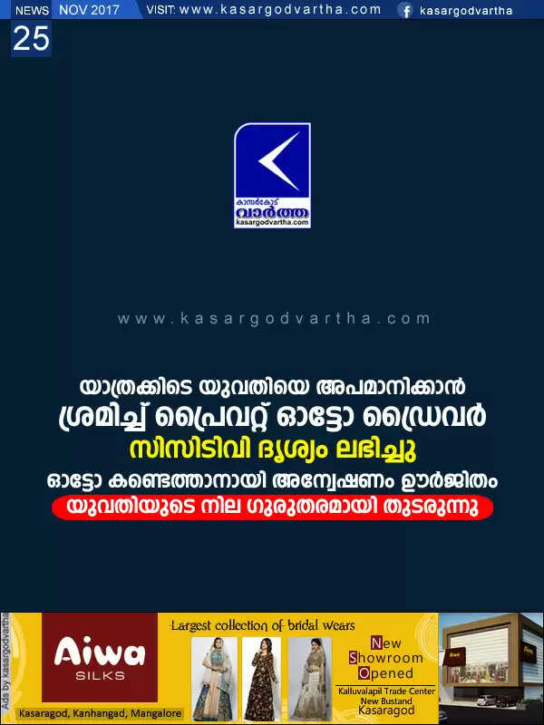 Keywords: Kerala, Cheruvathur, news, Injured, Auto Driver, Molestation-attempt, Investigation, Police, Women critically injured after fall from auto rickshaw