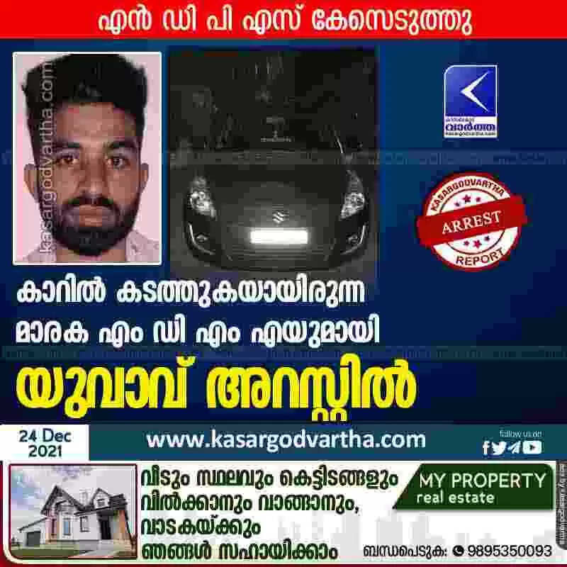 കാറിൽ കടത്തുകയായിരുന്ന മാരക എം ഡി എം എയുമായി യുവാവ് അറസ്റ്റിൽ