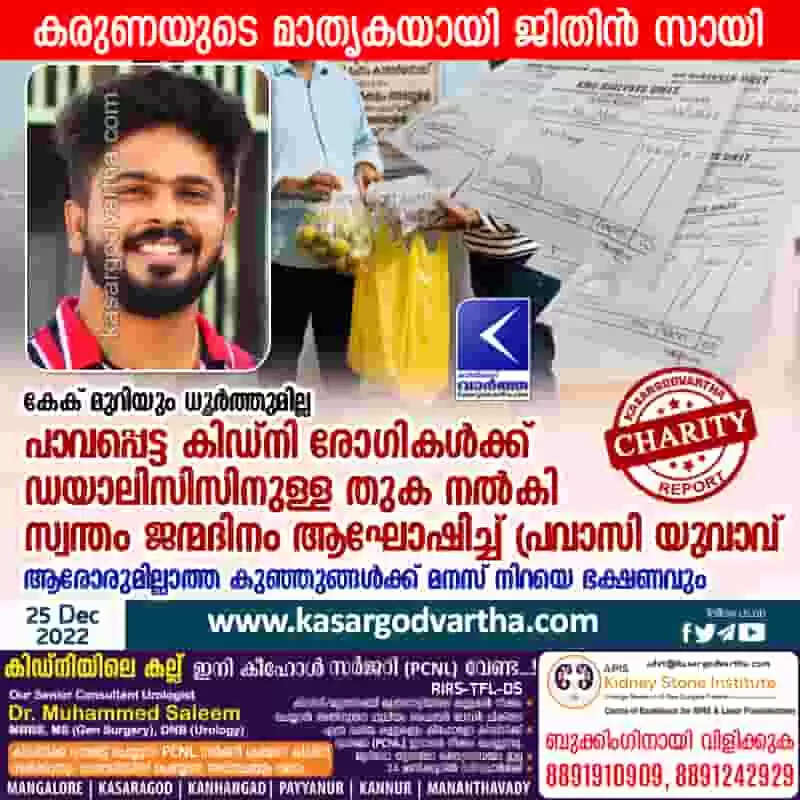 Charity | കേക് മുറിയും ധൂര്‍ത്തുമില്ല; പാവപ്പെട്ട കിഡ്നി രോഗികള്‍ക്ക് ഡയാലിസിസിനുള്ള തുക നല്‍കി സ്വന്തം ജന്മദിനം ആഘോഷിച്ച് പ്രവാസി യുവാവ്; ആരോരുമില്ലാത്ത കുഞ്ഞുങ്ങള്‍ക്ക് മനസ് നിറയെ ഭക്ഷണവും; കരുണയുടെ മാതൃകയായി ജിതിന്‍ സായി