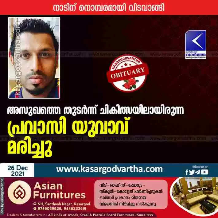 Keywords: Young man died due to illness, Kerala, News, Kasaragod, Thalangara, Treatment, Man, Death, Obituary, River, Wife.