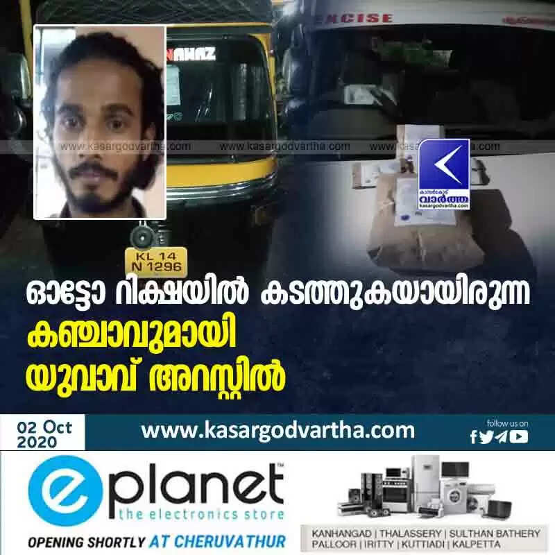 Keywords: Kerala, News, Kasaragod, Excise, Ganja seized, Ganja, Auto, Youth, Arrest, Custody, Youth arrested for smuggling cannabis in auto.