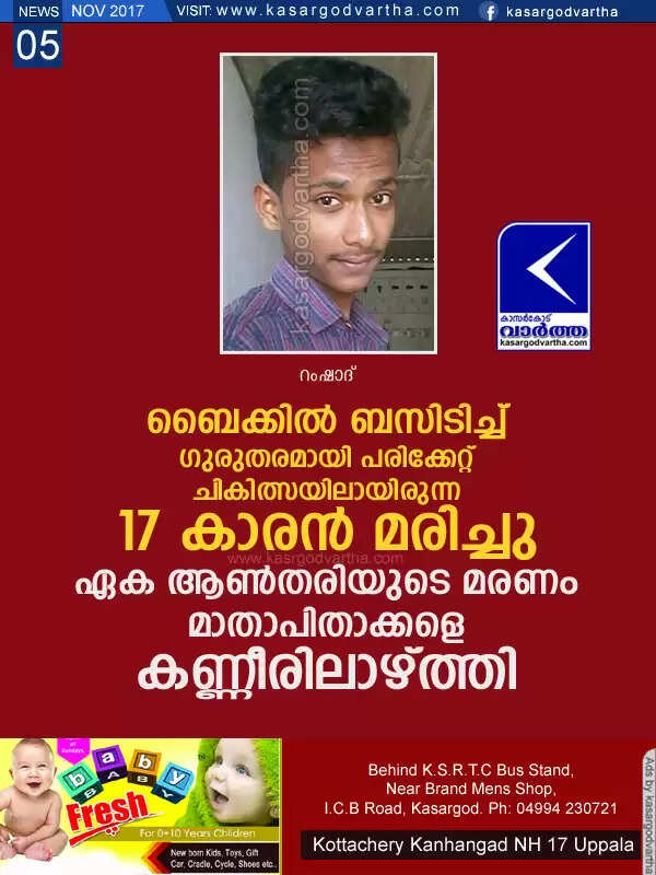 ബൈക്കില് ബസിടിച്ച് ഗുരുതരമായി പരിക്കേറ്റ് ചികിത്സയിലായിരുന്ന 17 കാരന് മരിച്ചു; ഏക ആണ്തരിയുടെ മരണം മാതാപിതാക്കളെ കണ്ണീരിലാഴ്ത്തി
