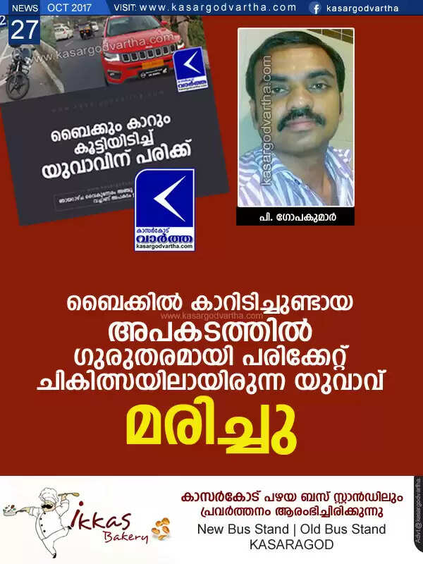 ഗോപകുമാര് സഞ്ചരിക്കുകയായിരുന്ന ബൈക്കില് കാറിടിക്കുകയായിരുന്നു. ഗുരുതരമായി പരിക്കേറ്റ ഗോപകുമാറിനെ മംഗളൂരുവിലെ ആശുപത്രിയില് പ്രവേശിപ്പിച്ചതായിരുന്നു. കാസര്കോട് കെ എസ് ആര് ടി സി ബസ് സ്റ്റാന്ഡില് സഹോദരി ഭര്ത്താവ് മധുവിന്റെ ഉടമസ്ഥതയിലുള്ള മധു ലോട്ടറി സ്റ്റാളിലെ ജീവനക്കാരനായിരുന്നു.