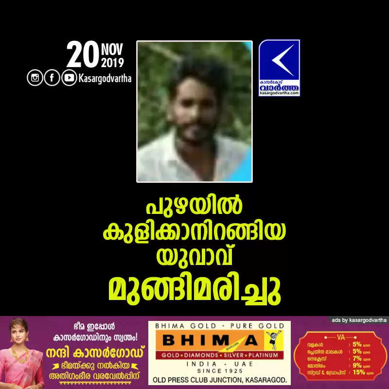 കുമ്പള: (www.kasargodvartha.com 20.11.2019) പുഴയില്‍ കുളിക്കാനിറങ്ങിയ യുവാവ് മുങ്ങിമരിച്ചു. കളത്തൂരിലെ ഉദയകുമാര്‍ ഷെട്ടിയുടെ മകന്‍