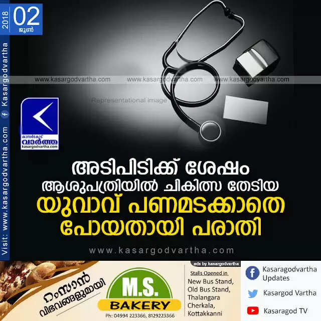 അടിപിടിക്ക് ശേഷം ആശുപത്രിയില് ചികിത്സ തേടിയ യുവാവ് പണമടക്കാതെ പോയതായി പരാതി