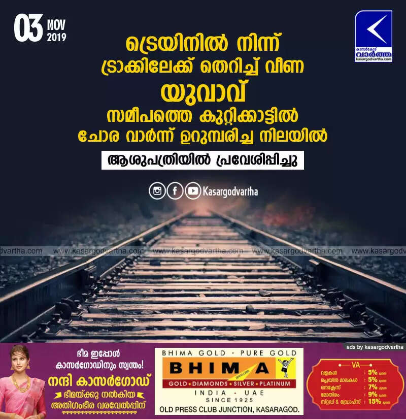 ട്രെയിനില് നിന്ന് ട്രാക്കിലേക്ക് തെറിച്ച് വീണ യുവാവ് സമീപത്തെ കുറ്റിക്കാട്ടില് ചോര വാര്ന്ന് ഉറുമ്പരിച്ച നിലയില്; ആശുപത്രിയില് പ്രവേശിപ്പിച്ചു