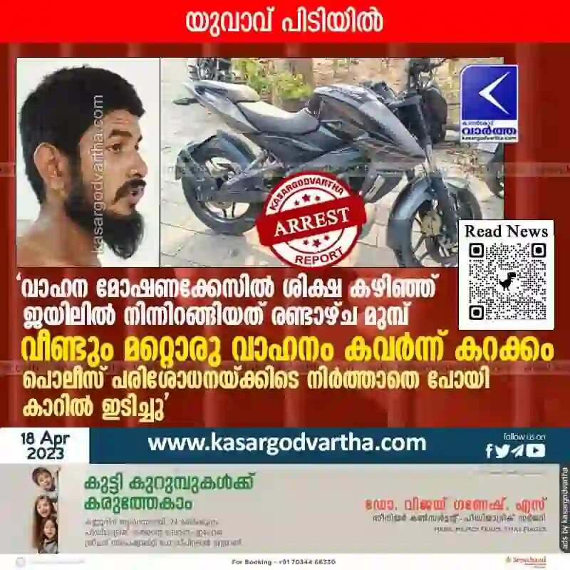 Youth Held | 'വാഹന മോഷണക്കേസിൽ ശിക്ഷ കഴിഞ്ഞ് ജയിലിൽ നിന്നിറങ്ങിയത് രണ്ടാഴ്ച മുമ്പ്; വീണ്ടും മറ്റൊരു വാഹനം കവർന്ന് കറക്കം; പൊലീസ് പരിശോധനയ്ക്കിടെ നിർത്താതെ പോയി കാറിൽ ഇടിച്ചു'; യുവാവ് പിടിയിൽ