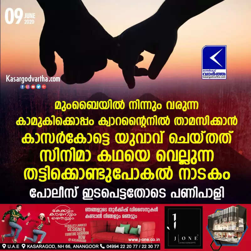 മുംബൈയില്‍ നിന്നും വരുന്ന കാമുകിക്കൊപ്പം ക്വാറന്റൈനില്‍ താമസിക്കാന്‍ കാസര്‍കോട്ടെ യുവാവ് ചെയ്തത് സിനിമാ കഥയെ വെല്ലുന്ന തട്ടിക്കൊണ്ടുപോകല്‍ നാടകം; പോലീസ് ഇടപെട്ടതോടെ പണിപാളി!