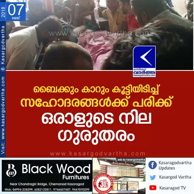 അപകടമുണ്ടായത്. സഹോദരങ്ങള് സഞ്ചരിച്ച ബൈക്ക് കാറുമായി കൂട്ടിയിടിക്കുകയായിരുന്നു. ഓടിക്കൂടിയ നാട്ടുകാര് ഉടന് തന്നെ ഇരുവരെയും കാസര്കോട് കെയര്വെല് ആശുപത്രിയിലെത്തിക്കുകയും നില ഗുരുതരമായതിനാല് മംഗളൂരുവിലേക്ക് മാറ്റുകയുമായിരുന്നു. അപകടത്തില് യുവാവ് ധരിച്ചിരുന്ന ഹെല്മറ്റ് തകര്ന്നിരുന്നു.