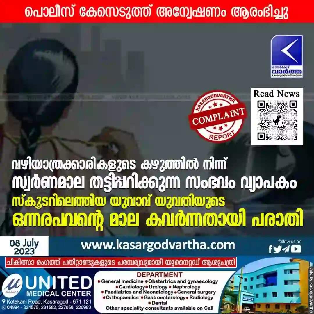 അതേസമയം, വഴിയാത്രക്കാരികളുടെ കഴുത്തിൽ നിന്ന് സ്വർണമാല തട്ടിപ്പറിക്കുന്ന സംഭവം വ്യാപകമാവുകയാണ്. ഏതാനും മാസങ്ങൾക്കിടെ ഇത്തരത്തിലുള്ള നിരവധി കവർചകളാണ് നടന്നത്. വിദ്യാനഗർ, മേൽപറമ്പ്, ബേക്കൽ സ്റ്റേഷൻ പരിധികളിൽ വഴിയാത്രക്കാരികളായ സ്ത്രീകളുടെ കഴുത്തിൽ നിന്ന് ബൈകിലും, സ്കൂടറിലുമെത്തി മാല പൊട്ടിച്ച നിരവധി കേസുകൾ റിപോർട് ചെയ്തിട്ടുണ്ട്. പ്രതികൾ പിടിയിലാവാത്തത് ആശങ്ക സൃഷ്ടിക്കുന്നതിനിടെയാണ് പുതിയ കേസ് കൂടി രജിസ്റ്റർ ചെയ്തിരിക്കുന്നത്.