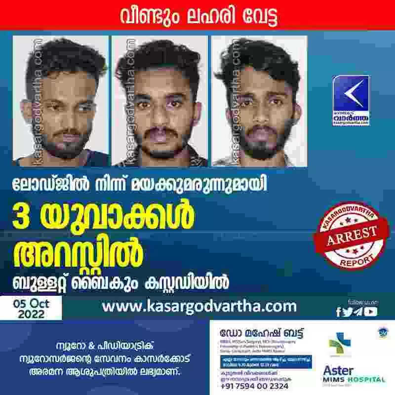 Drug Seized | ലോഡ്ജിൽ നിന്ന് മയക്കുമരുന്നുമായി 3 യുവാക്കൾ അറസ്റ്റിൽ; ബുള്ളറ്റ് ബൈകും കസ്റ്റഡിയിൽ
