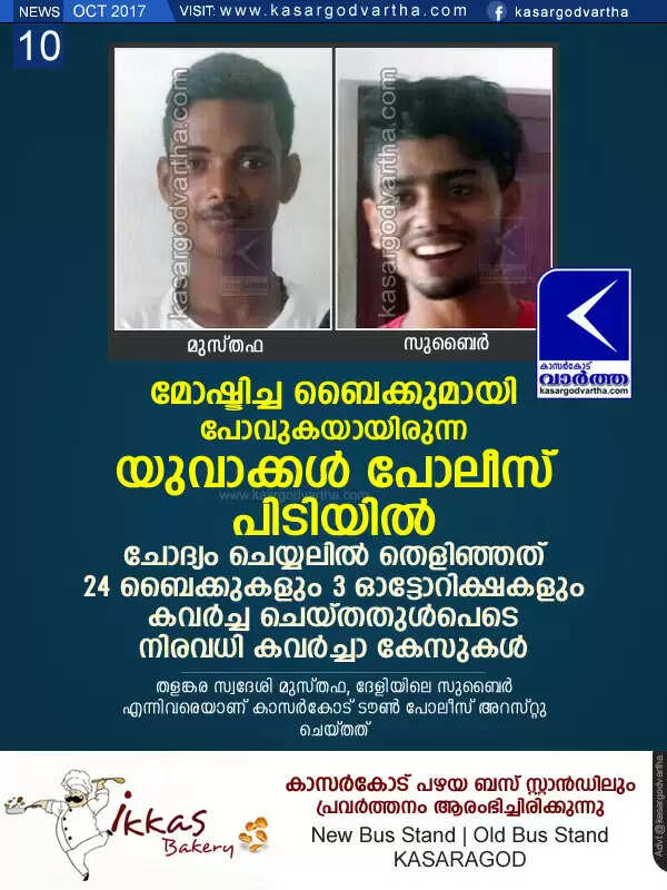 കാസര്‍കോട്: (www.kasargodvartha.com 10.10.2017) മോഷ്ടിച്ച ബൈക്കുമായി പോവുകയായിരുന്ന യുവാക്കള്‍ വാഹനപരിശോധന നടത്തുകയായിരുന്ന പോലീസ് സംഘത്തിന്റെ പിടിയിലായി. ഇവരെ പോലീസ് വിശദമായി ചോദ്യം ചെയ്തപ്പോള്‍ തെളിഞ്ഞത് നിരവധി കവര്‍ച്ചാ കേസുകള്‍. തളങ്കര സ്വദേശി മുസ്തഫ (22), ദേളിയിലെ സുബൈര്‍ (22) എന്നിവരെയാണ് കാസര്‍കോട് സി ഐ അബ്ദുര്‍ റഹീമിന്റെ നേതൃത്വത്തിലുള്ള പോലീസ് സംഘം പിടികൂടിയത്.
