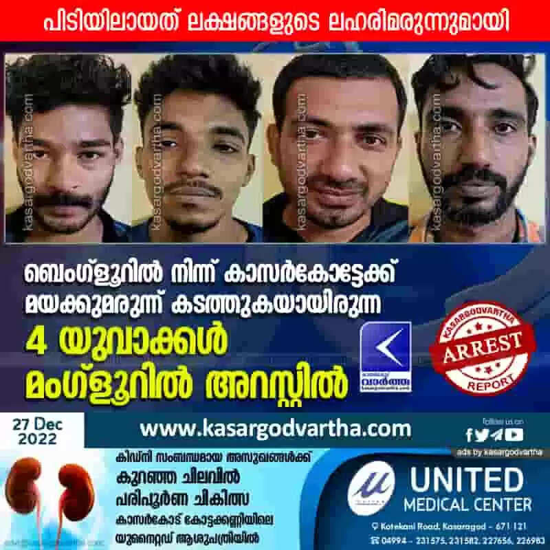 Arrested | ബെംഗ്ളൂറിൽ നിന്ന് കാസർകോട്ടേക്ക് മയക്കുമരുന്ന് കടത്തുകയായിരുന്ന 4 യുവാക്കൾ മംഗ്ളൂറിൽ അറസ്റ്റിൽ; പിടിയിലായത് ലക്ഷങ്ങളുടെ ലഹരിമരുന്നുമായി
