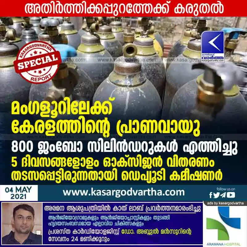 മംഗളൂറിലേക്ക് കേരളത്തിന്റെ പ്രാണവായു; 800 ജംബോ സിലിൻഡറുകൾ എത്തിച്ചു, 5 ദിവസങ്ങളോളം ഓക്സിജൻ വിതരണം തടസപ്പെട്ടിരുന്നതായി ഡെപ്യൂടി കമീഷണർ